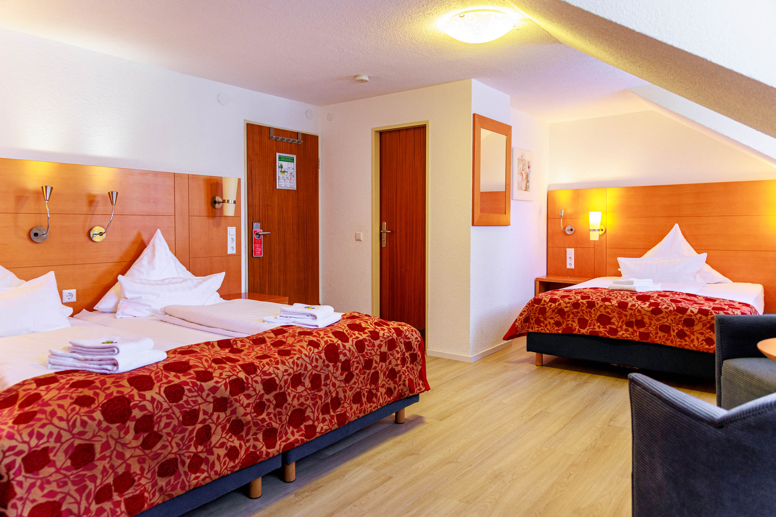 Familienzimmer/4-Bett Zimmer: Unsere großen 4-Bett Zimmer sind alle mit je einem 160x200cm französischen Doppelbett, sowie einem 180x200cm Doppelbett oder zwei 90x200cm Einzelbetten ausgestattet. Zustell- und Babybetten sind verfügbar. Kein Balkon möglich.